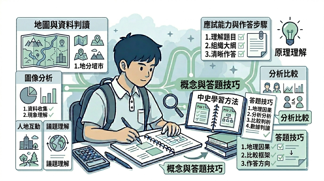 地理科不只是記住地理現象與課題內容,更重視學生是否能夠閱讀圖像與數據、理解空間關係、分析人地互動,並以較清晰的因果與比較框架回應題目。
